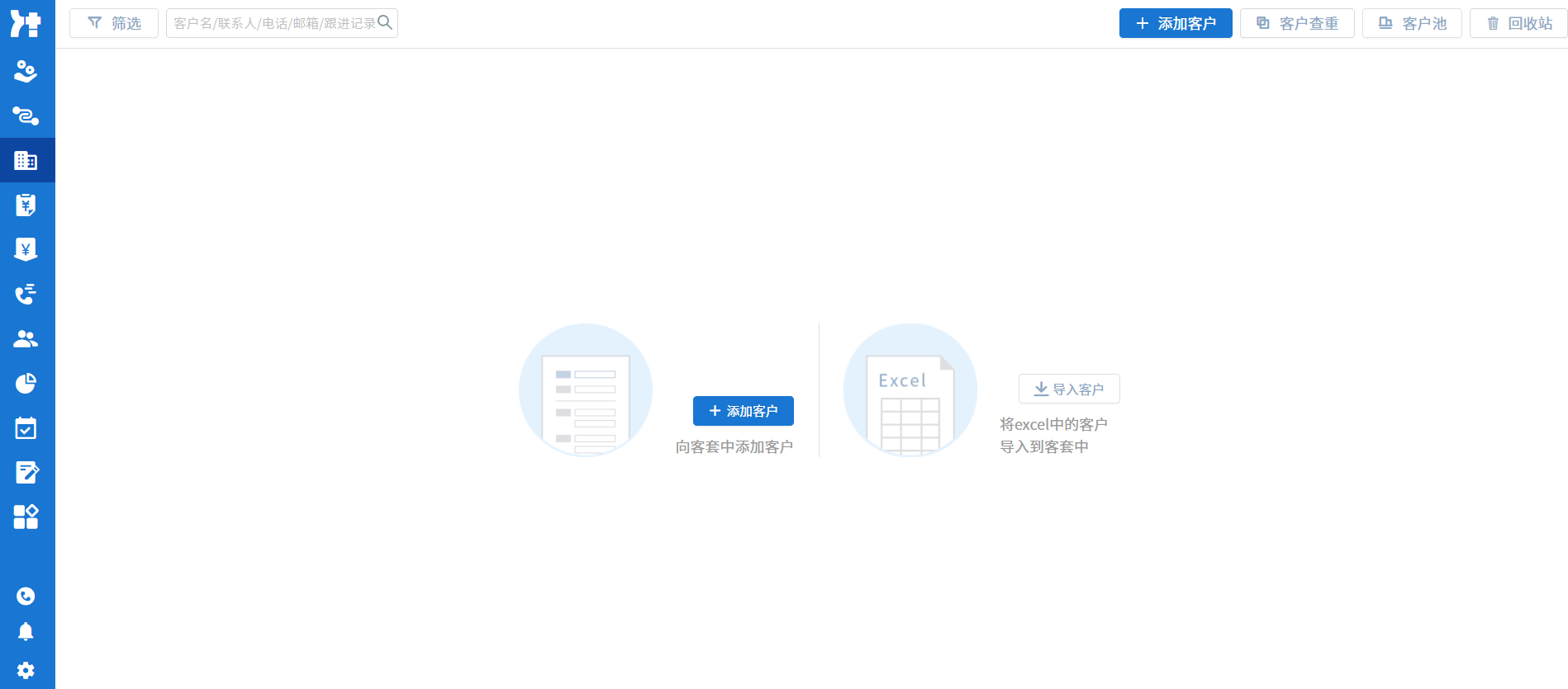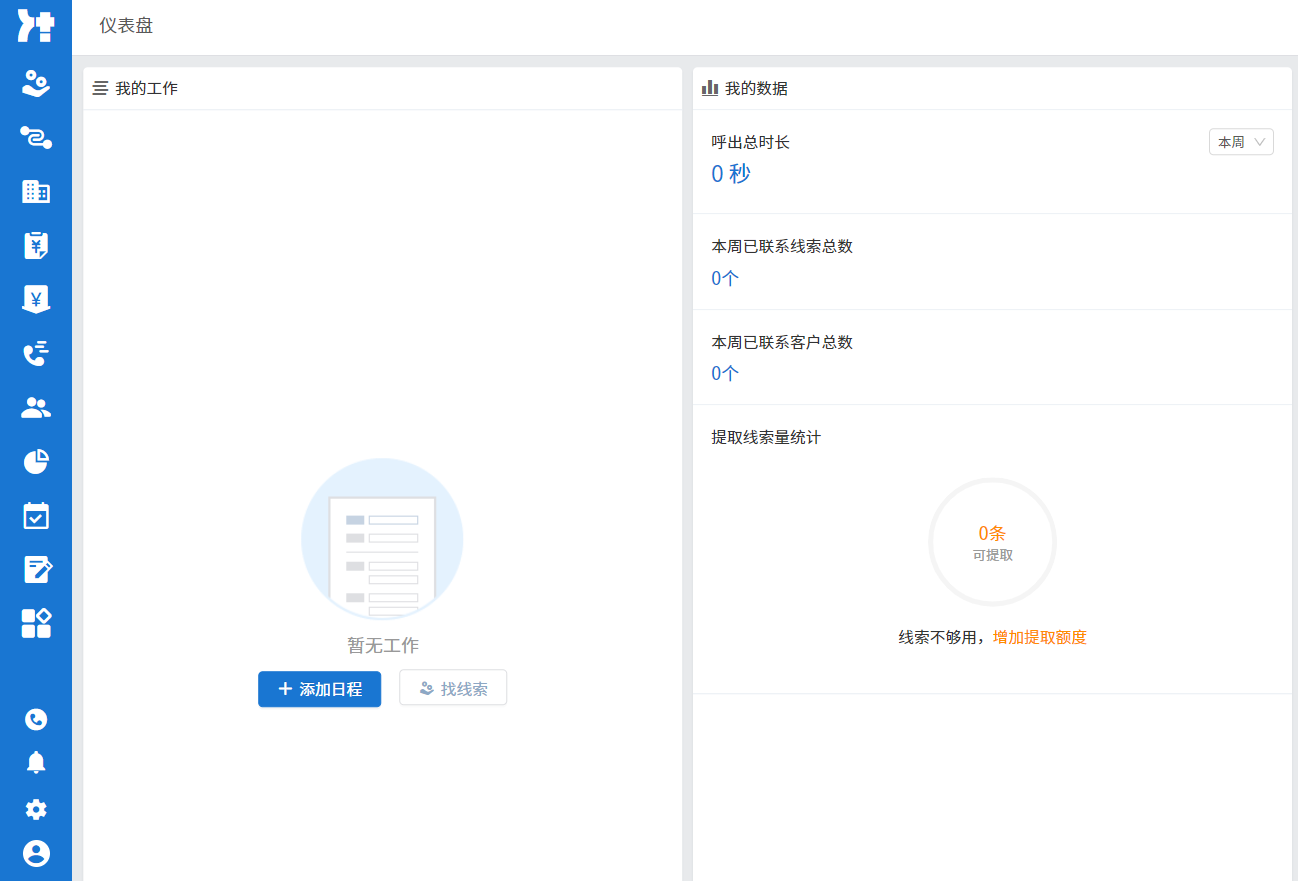 在该页面可以直观的查看完整的销售流程,流程中各阶段客户数量及当前状态。同时,在该页面可以方便切换查看后台管理、快捷功能(包括我的工作、客户筛选、添加客户、通话记录、申请审批、合同管理)等等。
